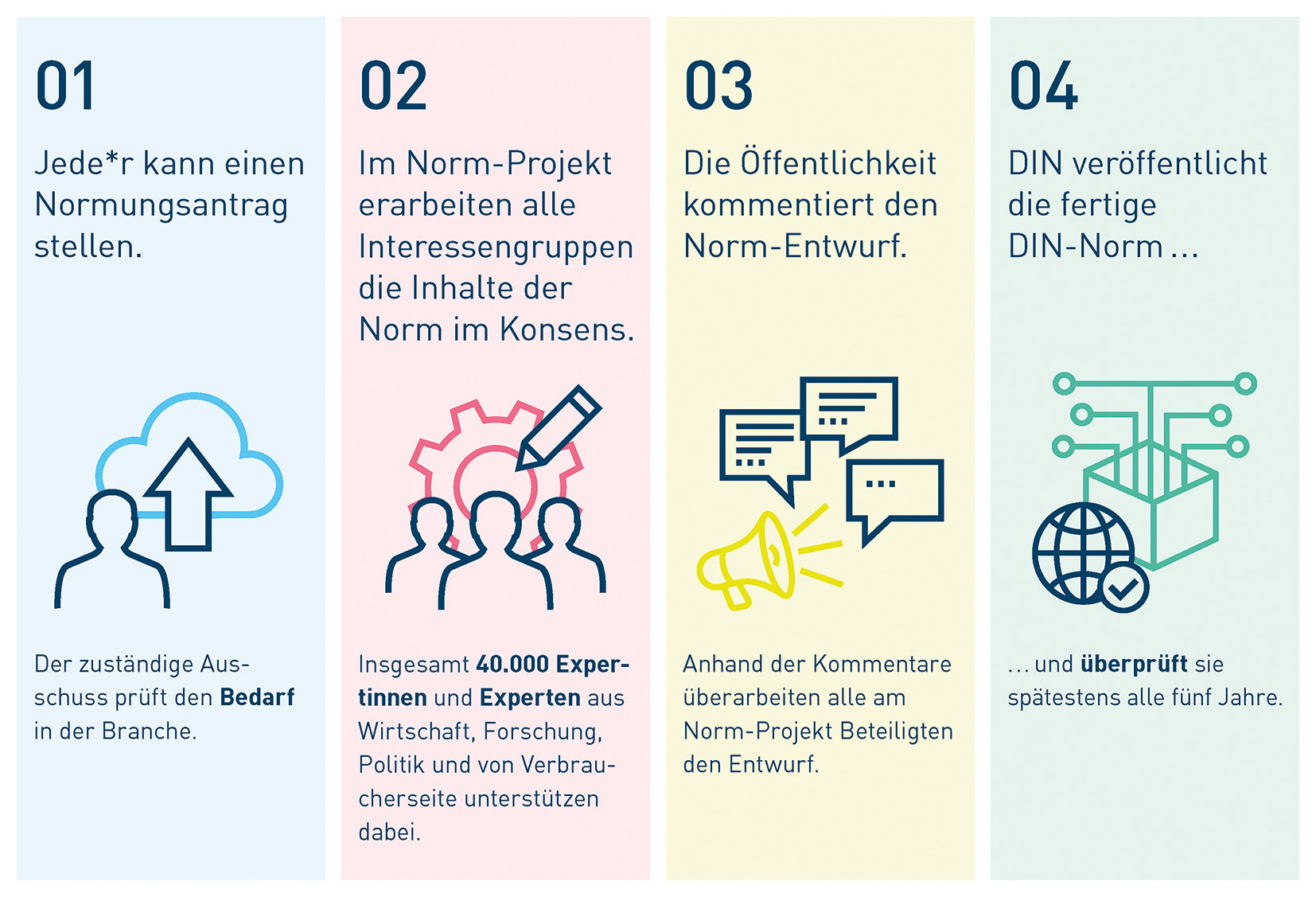 Creation of a standard: submission of a proposal, consensus building, public commenting and publication by DIN. Source: DINThe German Institute for Standardisation (DIN), Berlin, is the independent platform for standardisation in Germany and worldwide. As a partner for industry, research and society as a whole, DIN plays a major role in helping innovations – also in mining and the raw materials industry – to reach the market in areas such as the digital economy or society, often within the framework of research projects.