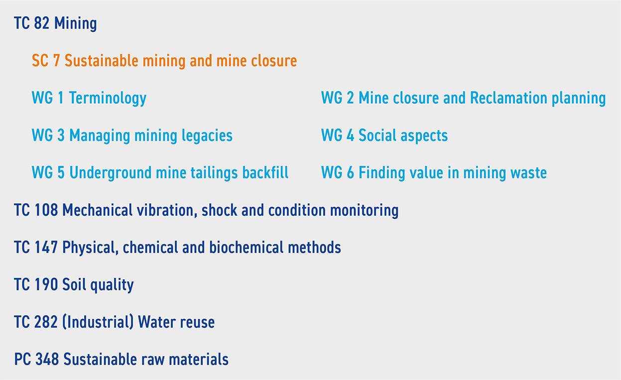 Organisation of ISO/TC 82 Mining and SC 7 with links to other ISO Committees (selection). Source: ISO/TC 82/SC 7 (2025): Sustainable mining and mine closure.Abandoned (legacy) mines globally impact the perception and reality of mining as a sustainable extractive industry. It is only when mine landforms are safe, stable and non-polluting that they have the potential to provide the foundation for sustainable post-mining land uses including being returned to earlier uses or being used for new and even multiple uses. However, the starting point for mining legacies is a degraded biophysical state, perhaps dangerous and where land-connected people and communities have been disconnected and had livelihoods disrupted. The ISO 24419 “Managing mining legacies” standard is a relatively new standard which details how to take negative legacies and create beneficial post-mining uses and social reconnections. Developed in two parts, this standard was informed by the United Nations Sustainable Development Goals (UN SDGs). This context ensured the many and varied dimensions of …