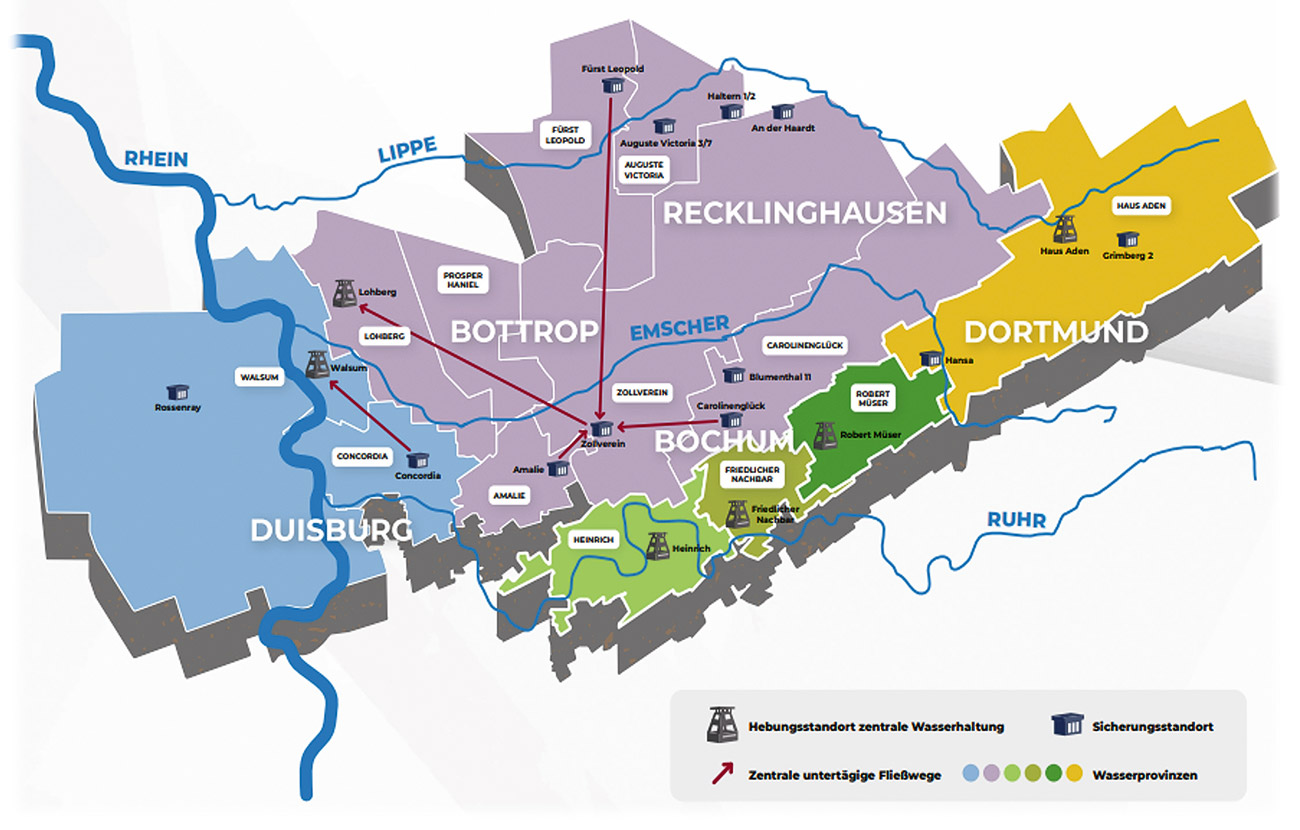 Water provinces in the Ruhr region and flow paths of the Lohberg water province. Source: RAGWith the end of hard coal mining in Germany in 2018, the operational need for underground water management ceased to exist. Since then, RAG Aktiengesellschaft, Essen/Germany, has been pursuing the goal of optimising mine water management in an ecologically and economically sustainable manner. The focus is particularly on protecting the surface, improving the ecology of the receiving waters and, depending on the region, protecting the groundwater resources used for drinking water production.